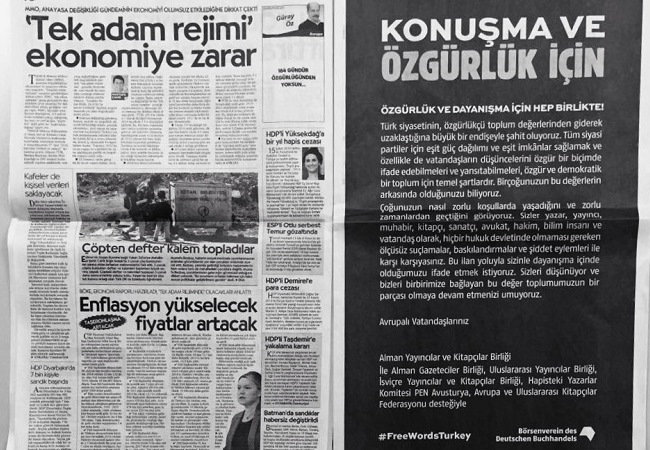 The IPA was among 400 donors of more than €16,000 raised in four days to fund full-page solidarity ads in Turkish news media expressing unity with the country’s oppressed writers, publishers, journalists and academics ahead of a crucial constitutional referendum, on April 16.